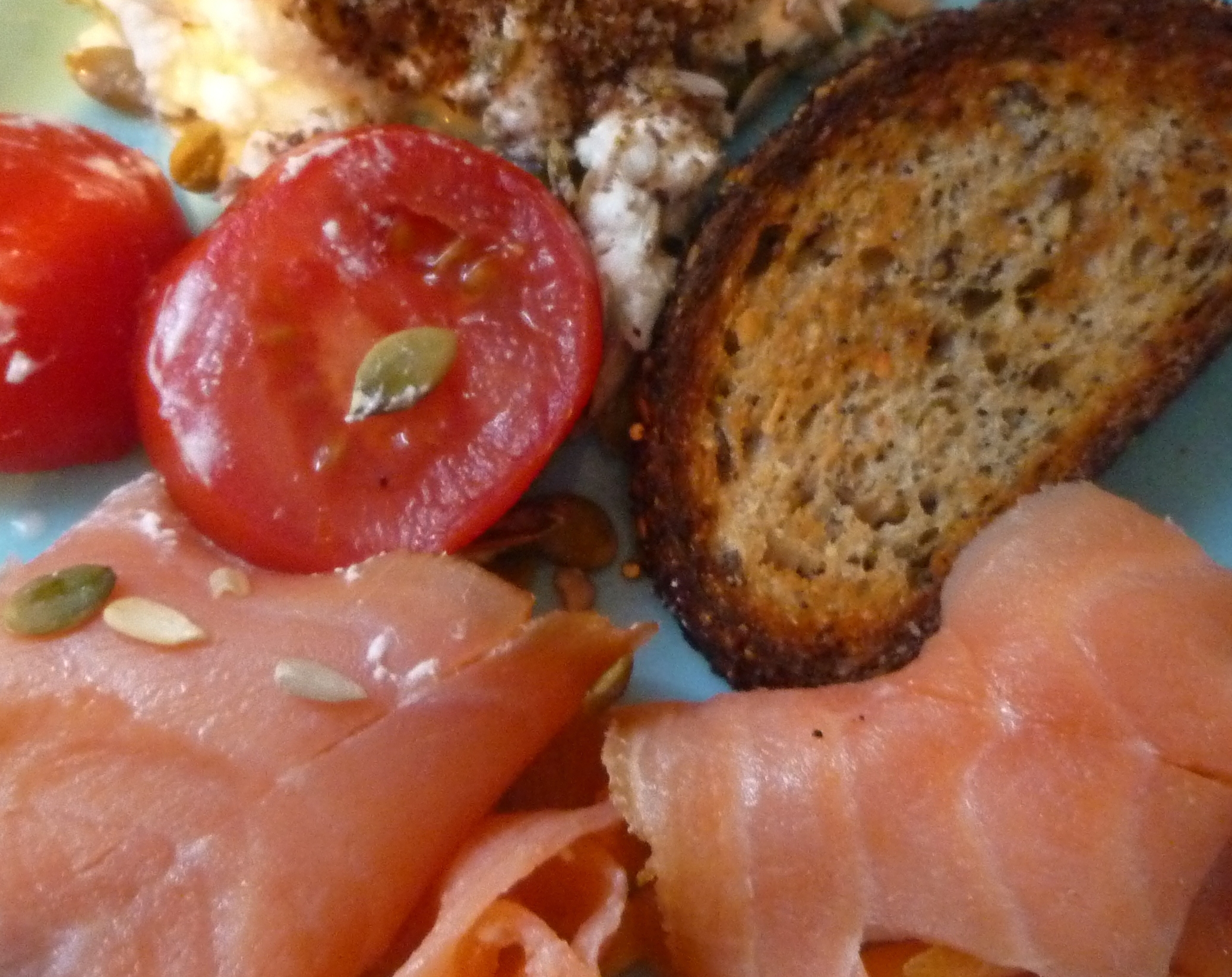 Smoked kipper or mackerel (You may think I am crazy but they are fantastic for brekkie! They are really tasty and SO good for you…Give them a go!) with cherry tomatoes and 1 slice of multi seed toast